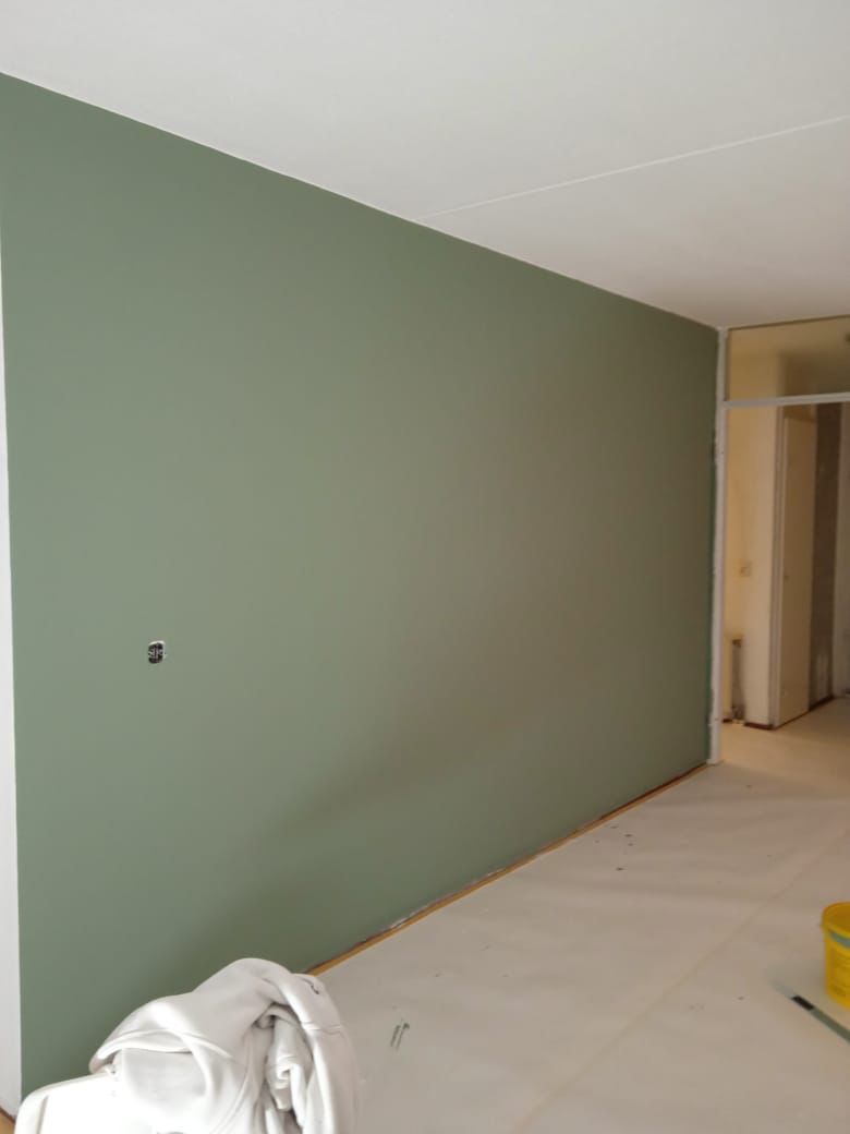 Voor een renovatie klus in een appartement hebben wij het schilderwerk in Gouda uitgevoerd. Hier hebben wij de plafonds gewit en de muren gesaust. Waarvan diverse muren in de kleur groen. De overzet plinten volgen nog om het een nette uitstraling te geven.